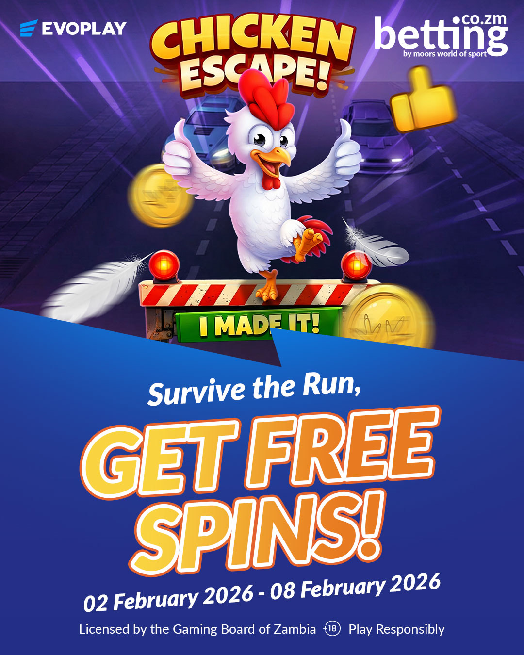 Play Uncrossable Rush during the Chicken Escape tournament on MWOS Zambia, complete daily missions, and collect Free Spins — the more you play, the more you win!